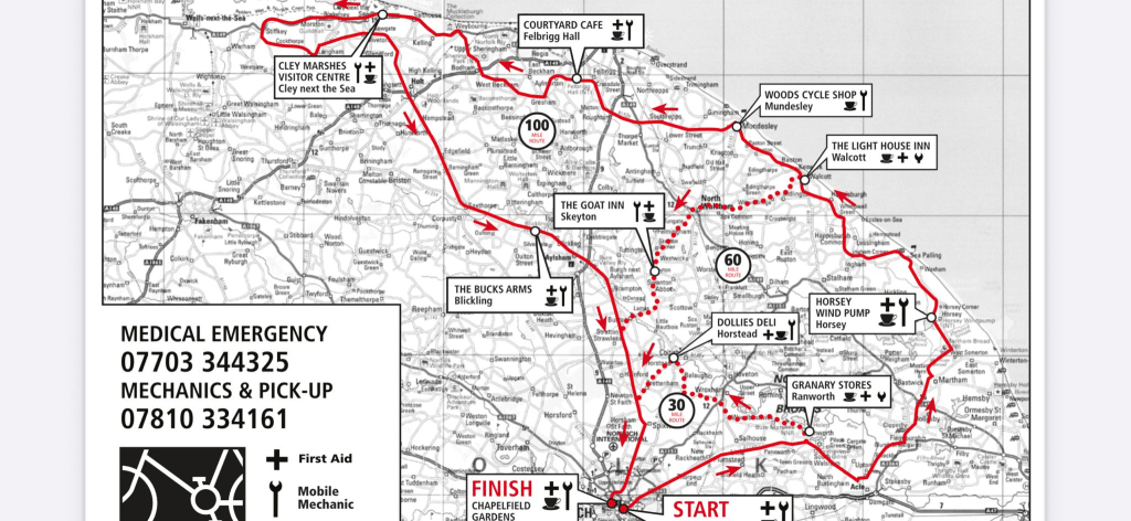 2nd June 2025 – the Norwich 100 is held annually by Bike Events and follows a fantastic route from Norwich City Centre Forum, along the Norfolk Coast back to the City for Refreshments at Chapefield Gardens.